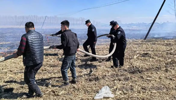 到達現場后,只見玉米地壟溝中的秸稈大面積起火,火勢熊熊,濃煙滾滾。五里明派出所的工作人員沒有絲毫猶豫,迅速展開消防救火工作。李華龍、王宇等四人分工明確,配合默契,一邊疏散周邊群眾,一邊向火場噴水救火。在五里明派出所工作人員的奮力撲救下,火勢得到了初步控制。隨后,肇東市消防大隊工作人員也趕到了現場。兩支隊伍迅速匯合,共同投入到緊張的滅火戰斗中。在大家的共同努力下,經過一段時間的奮戰,大火終于被成功撲滅。