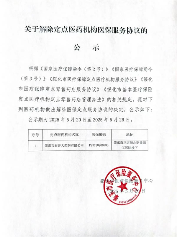 關于解除定點醫(yī)療保險醫(yī)保服務協(xié)議的公示